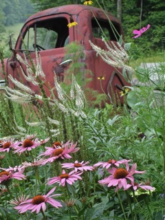 ferns. The beds, dense and deep, hold plants encouraged to retain their wildness. The stone work is both old and ongoing and all the stone comes from this land. A few of Eric’s old trucks have settled in and I’ve appropriated them as garden ornaments. The garden keeps expanding, I can’t help it. My son once laughingly called it my version of manifest destiny.